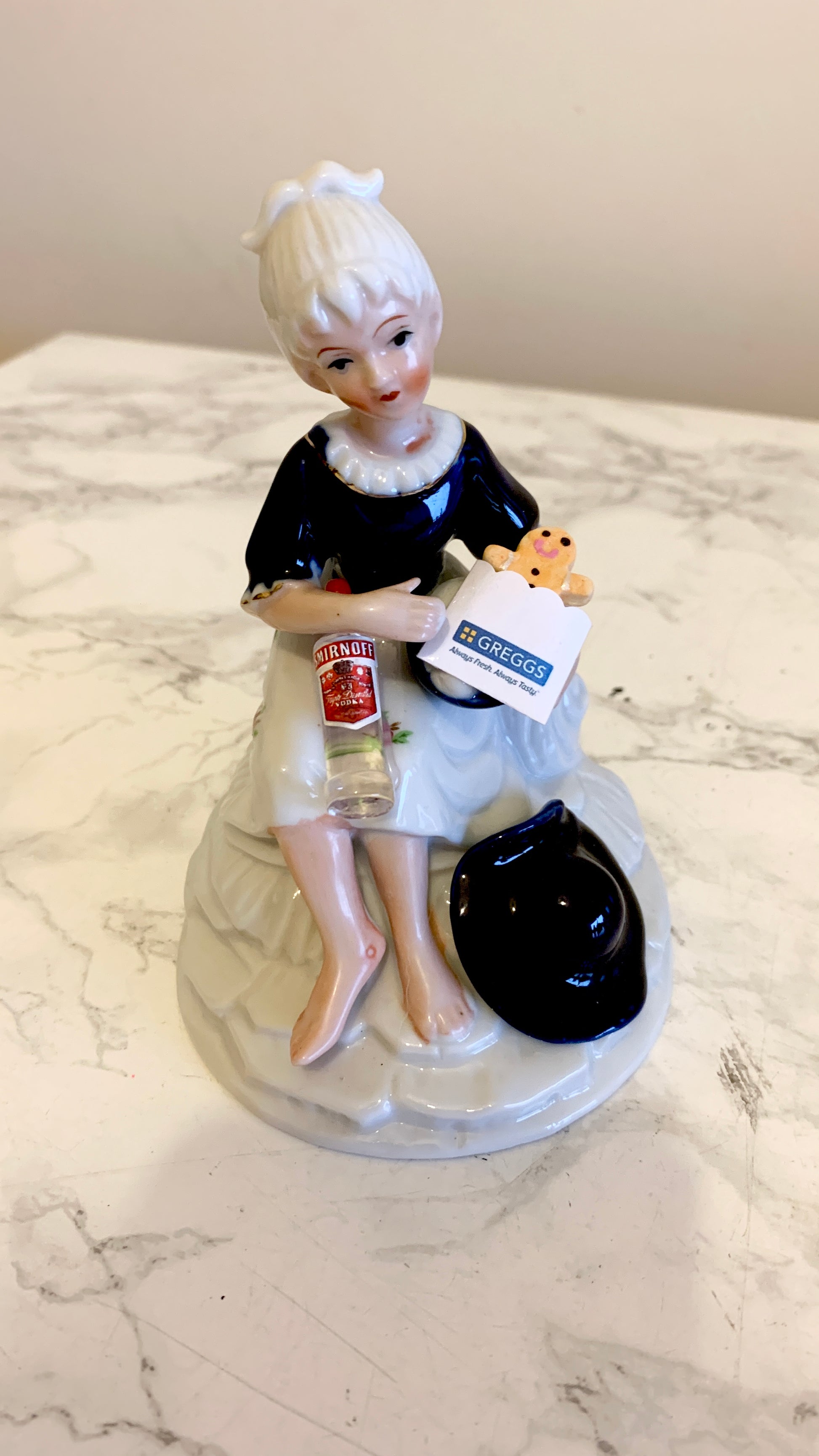 These upcycled vintage figurines blend classic porcelain charm with a modern, playful twist. Each piece starts as an authentic vintage ornament, carefully sourced and then reworked by hand with unexpected details that turn it into a true statement piece.